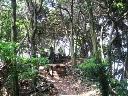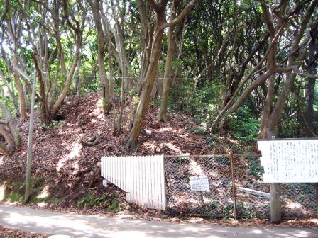林の中に入っていくとすぐに、三浦市の新井城址の説明板が立つ。「相模湾に突き出したこの半島は、小網代湾と油壺湾と三方が海に囲まれ、陸地に通じる路は、北方3kmのある大手の引橋で、この橋以外には攻めこめれない堅固な城構えであった。(今は関東大震災による隆起で、小網代湾の東に陸地部分が増えおり、引橋の面影は、地名にだけ現れている。。) 右側の小高い丘に向かって空堀の跡のような痕跡がある。 |