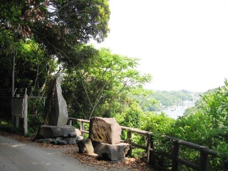 「かながわの景勝50選 油壺湾」の石碑がたち、油壺湾を左に見る。 永正13年(1516)新井城を最後の居城と して立て籠もった三浦一族が北条早雲の大軍を相手に3年間にわたって奮戦したが、三浦道寸義同(よしあつ)、その子・荒次郎義意(よしおき)は自刃、他の将兵も油壺湾へ投身したと伝えられ、湾一面が血汐で染まり、油を流したようになったので、後世「油壺」といわれるようになったという。 |