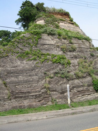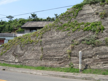 海戸町の海岸沿いの道路の左側に特別目立つ崖があり、地層が露出している。「三浦市海外町のスランプ構造」という大きな説明板が立ち、詳しくその成り立ちを解説している。 地層が柔らかいうちに海底地すべりなどで変形したものという。 専門的なので、そのまま紹介する。 三浦市海外町の海岸一帯に露出する三崎町砂岩シルト岩互層(三崎層)は、三浦層群最下部層で、地質年代が第三期の海底で推積した、主に灰色のシルト岩と黒色のスコリア質の凝灰岩や砂岩の互層からできています。 この崖の地層には、地質形成当時の環境を知る手がかりとなるスランプ構造がみられます。スランプ構造とは、未だ固まっていない推積物が一時的に海底などの斜面をすべり下った結果生じた特異な推積構造です。 この推積構造を示す互層の形状は、上部は正常層の推積面とほぼ並行しています。下底は、東から西に傾いたすべり面を境ちして、下位は正常層と接しています。このすべり面は露頭の西半部で正常層の推積面と一致してくるため、東半部でのみ下位層の層理を高角度で切った形を示しています。崖面のスランプ構造には、軸面をわずかに東に傾けた一つの背斜(波状をあらわす地層の峰の部分)と、その東に続くごくゆるい向斜(波状をあらわす地層の谷の部分)からなる見事な波状に曲がった褶曲がみとめられます。 このスランプ構造は、地層を構成するシルト岩やスコリア質の凝灰岩や砂岩が未だ固まっていないコロイド状態にあったとき、東から西に向かって海底地滑りによって転位変形した結果生じたものと考えられ、典型的な褶曲型のスランプ構造といえます。地層推積当時の推積環境を知る上で貴重です。 |