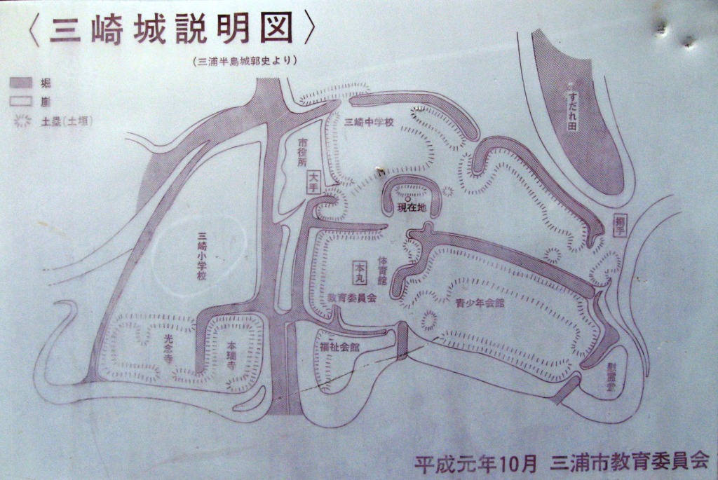 緩やかな坂道の先、右に市の体育館があり、その向かいの三崎中学校の生垣の前に三崎城の説明板と「三崎城跡」石碑が建つ。![]() それによると、体育館のあるところが、本丸 で、市役所前が大手口であった、という。 (説明図をクリック すると拡大) |