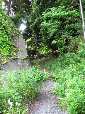 <マリンパーク >海岸沿いに三浦道寸の墓のある北側まで進もうとしたが、途中で崖に遮られている。 やむなくマリンパーク側に登って、脇をすすみ、マリンパークの駐車場の北端にでる。 ![]() 標識に従って林の中を進む。 |