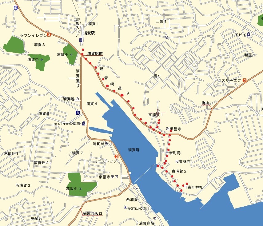 三浦半島の城めぐり(2) 浦賀城、新井城 三崎城を廻る地図 ①浦賀 ②油壺 ③三崎 |