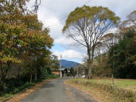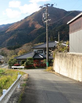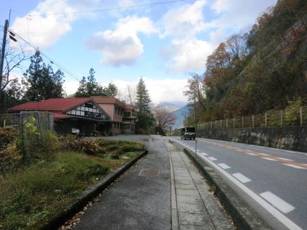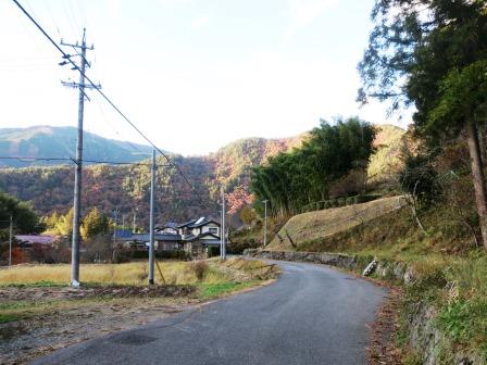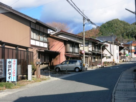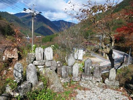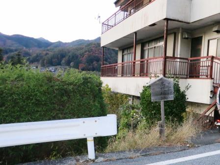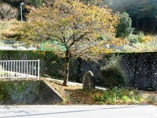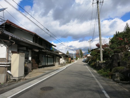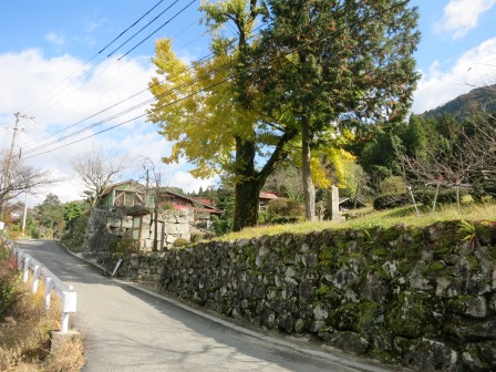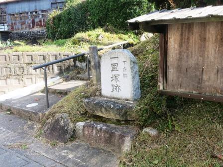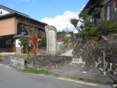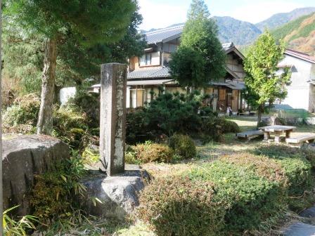 国道19号線の阿寺渓谷入口の交差点を近くに見て、広くなった通りをまっすぐに進み、下在郷にはいる。しばらくすると、右手に「下在郷 一里塚跡」と刻まれた花崗岩の新しいそうな碑がある。 |