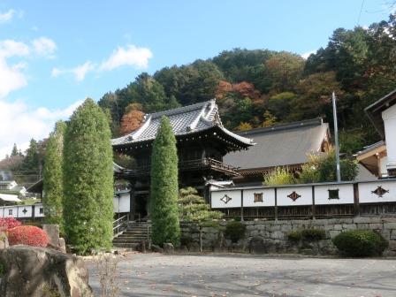 ちょうど紅葉が真っ盛りで、木曽町の興禅寺・長福寺とともに木曽の三大寺といわれるのにふさわしい趣である。 嘉慶年間(1387~88)に木曽氏11代木曽親豊が創建したという。現在の建物は、文禄(1592~95)の洪水のあと、当時木曽を領していた豊臣家の木曽代官 石川光義がが、慶長3年(1598)に再建したといわれる。 本堂・庫裏・山門いずれも桃山建造物で、「鶴亀蓬莱庭園」とともに、 近世禅宗寺院の姿を示しているという。 |