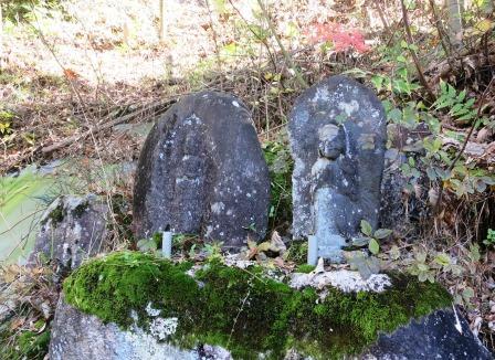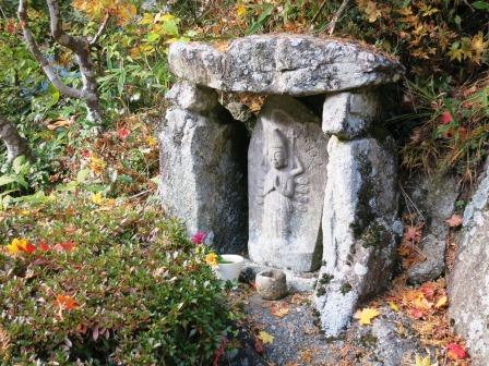 右手に少し入った先の天長院に、マリア地蔵があるというので、寄り道する。説明板によると、元は木曽家の祈祷所であったが、一度廃絶、その後、文禄年間(1592~94) 須原宿の定勝寺七代和尚により天長院として開かれ、寛文年間(1661~72)にこの地に移転したという。 山門の前に、石仏がある。子どもを抱いた像で、結ばれた紐が十字に見えないこともないが、近くにキリシタンがいた形跡もないから、単なる子育て地蔵だろうという。(参考の本より) ![]() 元の道に戻り、山裾沿いの道を進むが、天長院の先で、道は北に向かう。 バス道路にぶつかり、「右 岩出観音」の標識が立っている。 |