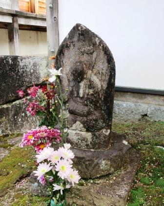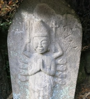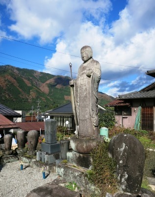 臨済宗妙心寺派の古刹で、創建は不詳。 寛永年間(1624~45)の大火により、焼失。本堂は享保11年(17269に再建された。 訪れた時は本堂、観音堂ともに改装中であった。 ![]() 裏庭には天保3年(1832)作といわれるマリア観音と呼ばれる石 仏がある。12本の手を持つ千手観音像をかたどっているが、左手に十字架を高く掲げているのがわかる。。 野尻川向にあったものを、現在の場所に安置したものという。 ![]() 門から見た野尻宿の町並みと向かいの山。 |