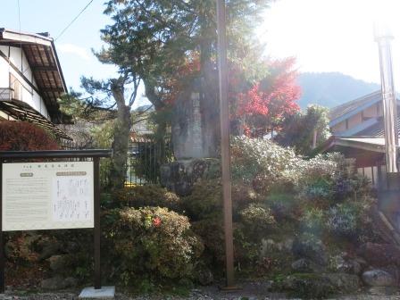 宿の東はずれ近く、緩やかな坂道の左手に、高札場跡がある。 道をこのまま進むと須原駅であるが、中山道は、ここから、左下を通る国道19号線に斜めに下っていた。(道がはっきりしない) 今回の中山道の歩きは、ここまでとし、今晩の宿を予約してある上松の「旅館 田政」に須原駅から電車でいく。 |