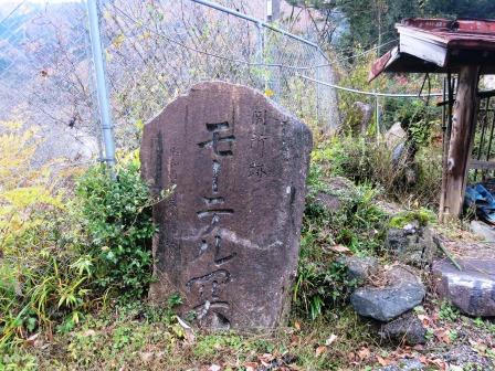 国道の左側の歩道からの木曽川と奥の山々の景色を堪能しながら進む。 下の写真は、同じ場所から下流をみたところ。 ![]() ![]() 数百m先の国道の右側には、旧道の名残である大きな石塔がたっている。 「金刀比羅神社 椎(?)河脇神社」 と刻まれている。 |