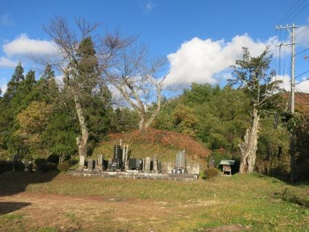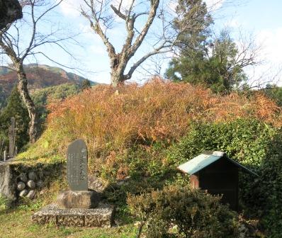 民家の庭の前を進んだ先に、墓地があり、その奥に一里塚がある。脇に、石碑が立っている。 「中仙道一里塚 当地は鎌倉時代より木曽の街道として栄えた。桃山時代に主要街道とされ、一里ごとに土を盛り塚とし 道標とした。」 とある。 |