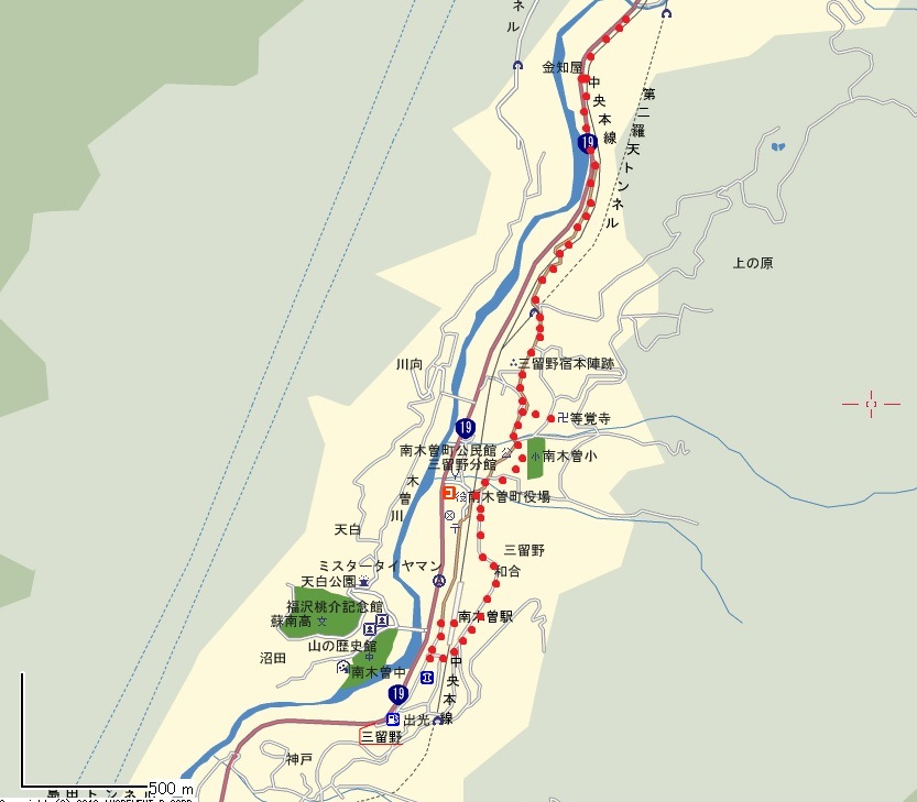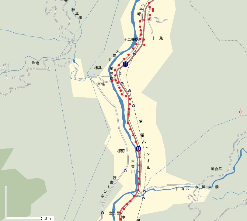 ここから先木曽福島の手前までは、国道19号線は木曽川とほぼ並行して続いており、一方 旧街道の中山道は、地形により国道に沿ったり大きく離れたりして進んでいく。 少し先、歩道の更に左側よりに、旧道の痕跡が残ってしばらく続いている。 この辺りは旧金知屋(かなちや)村といい、一里塚があったという。 ![]() ![]() 少し先のJR中央線の鉄橋下に、山道と木曽川に流れ込む川が見えてくる。 天保15年(1844)の土石流の犠牲者を弔うために建てられた蛇抜地蔵がその先に安置されているという。 ここからの国道横断ができなかったため、訪れるのをあきらめた。 |