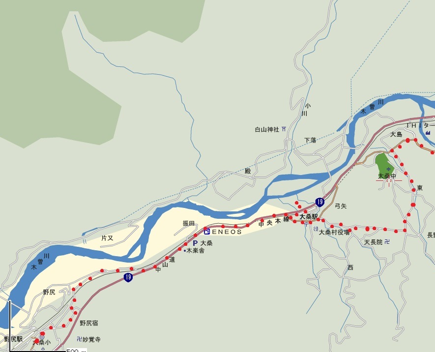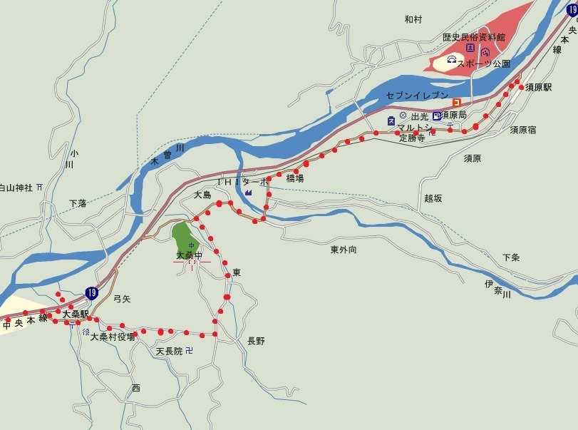 南木曽 - 須原 地図→①南木曽-金知屋 ②金知屋-十二兼 ③十二兼-野尻 ④野尻-大桑 ⑤大桑-須原 |