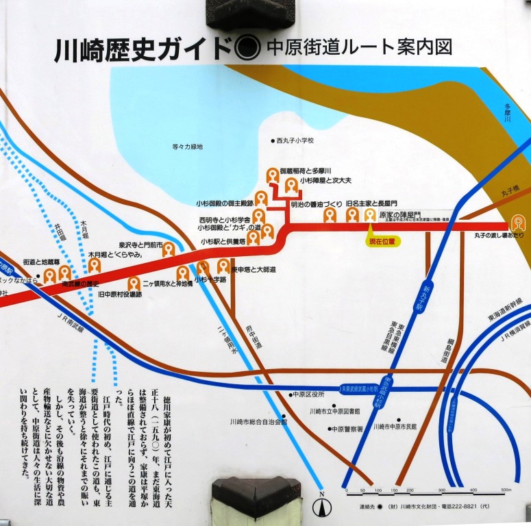 土手から西に向かい丸子橋交差点を横切り、東横線のガードをくぐって、間もなく右手に立派な門構えの日本家屋がある。 原家9代目 文次郎は、明治24年から22年の歳月をかけてここに母屋を完成させたという。川崎歴史ガイド「中原街道ルート案内図」が掲げられている。(クリックすると拡大) |