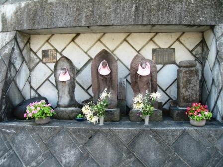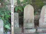 | 北に行き、左側からの環状3号線への入り口の角に3基の石仏が石垣の所に収められている。道路工事の関係でこの場所になったとおもわれる。両脇には力石と、享保10年(1725)の供養塔がある。小さな説明板がついている。いわく 「鎌倉古道 木曽の石仏 この石仏は旧鎌倉道の木曽と赤坂の境の辻に、行路の安全を願って安置されたもにで、風化が著しいが地蔵菩薩一体と如意輪観音または聖観音2体であり、造像年代は江戸元禄頃と推定される。又土地の性質から道祖神の役割も果たしていた」 |