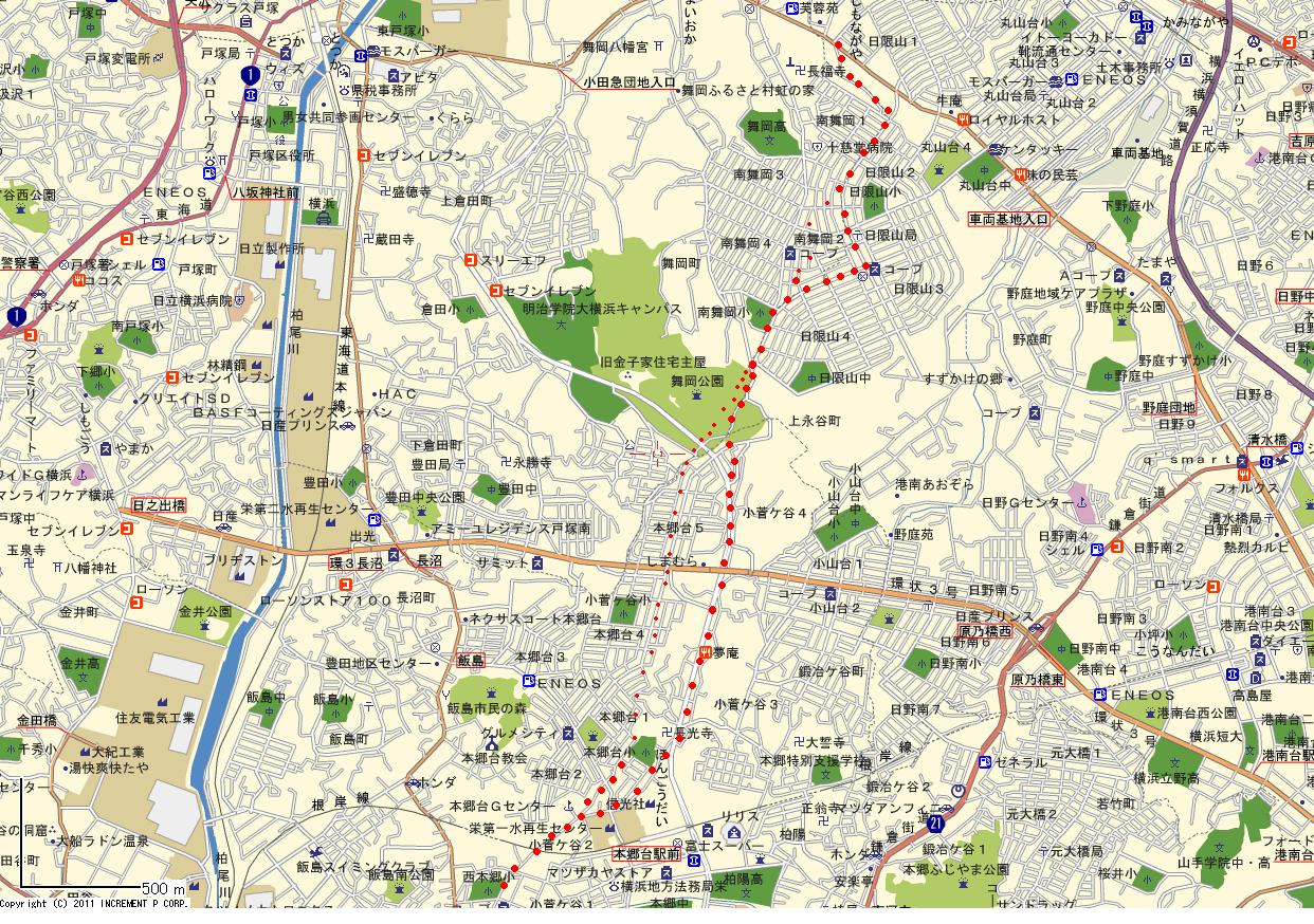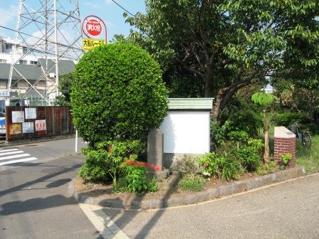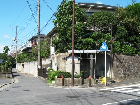 | 坂道の先の丘が舞岡公園として整備されており、その手前の道にぶつかる。車道は右折後左へ上がって行くが、旧街道は細い道をまっすぐ登る。(今ではほとんど使われていないようだ) 舞岡公園の南側に位置する場所に出る。 その先は京急港南ニュウタウンが広がり、公園を越えると、バスの発着場があり、その先は京急港南ニュウタウンが広がりる。 旧街道は北方面の日限地蔵がある小高い丘にむかうが、そこまでは完全に消えている |