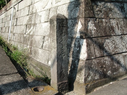 | JRのガードをくぐり、栄区下水処理場の手前で道は二手に分かれる。左側の坂道には、大きな民家があり、其の角に道票が立っている。 「坂・ぐみやうじ道」と書かれ、裏には、正徳5年(1715)とある。 |