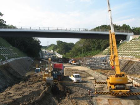 | 西谷戸のバス停をと環状3号を線過ぎるあたりからこの広い車道の右側に細い道がある。旧街道の名残とおもわれる。緩やかな坂道で、往時は「摺小鉢坂」といっていたという。北からくると谷間の底に下る形になるからという。 ただし、西側は道路の建設中で、東側は宅地造成中である。 この写真の上の橋は、舞岡公園から南下する尾根沿いの道である。 |