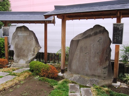 | 栗橋駅から旧街道に戻る前に、駅前の静御前の墓に寄る。 義経が藤原氏を頼って平泉に向かったあと、静御前も義経を慕っ 文化3年(1806)に建立されたという歌碑がある。 「舞う蝶の 果てや夢見る 塚の蔭」 |
