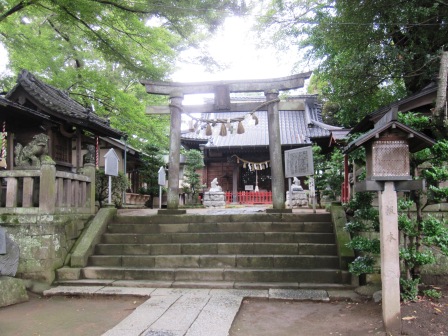 | 信号から300m程先の左手に鶴峯神社がある。 創立は養和元年(1181)で、頼朝の奥州征討の折り、戦勝祈願し武運が開け、鶴岡八幡宮の分霊を勧請したという。 その隣が、静御前遺跡の寺として有名な光了寺である。 |