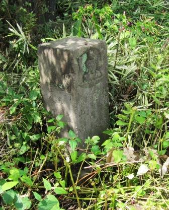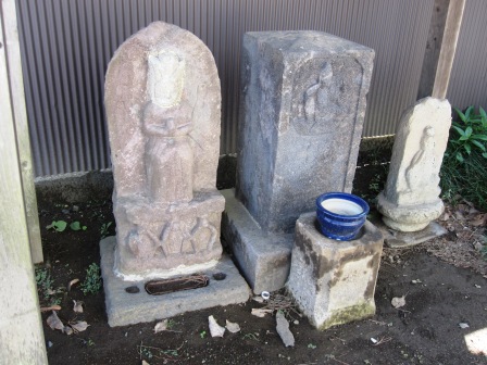 道を入ってすぐ左に文字庚申塔が立ち、その先の民家の前には真新しい馬頭観世音の石塔がある。 |