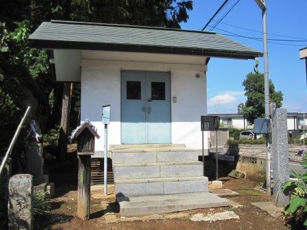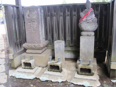 | 周りには空堀が残っており、古河公方館跡という石碑と案内板が立っている。この辺りは、旧御所沼に突き出た半島の高台で、足利成氏が建てた古河城の別館があった所という。 足利成氏は関東管領足利基氏の子孫で鎌倉にいたが、執事上杉憲忠(のりただ)と対立して康正元年(1455)古河城に移った。成氏は結城・佐竹・宇都宮・小山・千葉・里見など関東豪族の支持を受け、上杉氏が擁立した将軍義政の子政知の堀越公方と覇権をかけて争うことになった。その後4代晴氏の時北条氏康に攻められ、北条方についた。 5代義氏には跡継ぎがなく息女「氏女うじひめ)」がいたのみで、ここに移された。小田原攻略後、秀吉が名家の断絶を惜しみ子弓義明の孫国朝を跡継ぎにし、「氏女」を配して喜連川城主とした、という。 正面入口を出て、北に100mほど向かうと、虚空蔵菩薩(右)の入口があり、その右手にお堂があり子安地蔵が安置されている。 |
