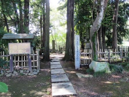 | 地蔵堂の前の道を北に行き、再び公園にはいる。左側の梅林を100mほど進むと、少し小高くなった林の中に、「足利義氏墓所」の石碑と説明板がある。右奥の土盛りの所が義氏の墓とされ、左には義氏の娘 氏女の石塔が立っている。 ここには、明治初めまで円覚寺末の徳源院という氏女の法号にちなんだ寺があったという。 公園から北に向かい、旧街道(公方通り)にもどる。 |