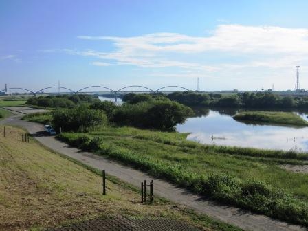 | 船渡門の外は 堤防にでると、南側に三国橋が架かっている。 堤防から公園側を見る→ |