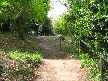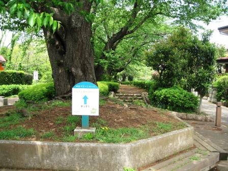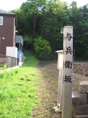 | 今までの途中に「与兵衛坂」という標柱があったので、そこまで戻り、丘に上る。 成瀬地域の伝承で 「東光寺に与兵衛という医者がいて評判だったが、遠回りしてくる患者のために自分の敷地の崖を切り取り、近道を作った」という。 |