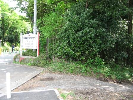 | すぐ先に左に分かれる道があり、「庚申塔 梅田講中」 と刻まれた細い石柱が立っている。 道標も兼ねていて、「左 大山みち」 「右・・・・みち」 とある。 市民の森として歩道が整備されている。谷戸を少しずつ上って行き、一番奥の所で、右がわの上り坂を選んで進んだ。 上りきると東洋英和女学院の裏門に出る。 |
