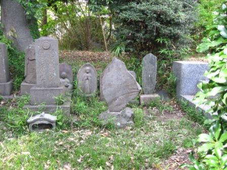 | その先100mほどで右に曲がり、その先に古い庚申塔がある。 正面の像の他は庚申供養の文字が見えるぐらいで、結構風化している石塔であった。 そこを左に曲がり道なりに行くと、長津田第二小学校がある。 芳賀氏によると、間もなく南への細道を上がると、東光寺跡があり、碑が立っているというが、いろいろ探しまわったが見つけることが出来なかった。 |