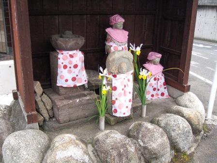 | 渡ってすぐ西に行くと、子育地蔵が石の祠に祀られている。 文政年間(1820年代)に、井上重郎左衛門が二児を失い、童子・童女の冥福を祈るために辻々に地蔵を祀ったという。それをここにまとめたという。 男女双立の道祖神→ |