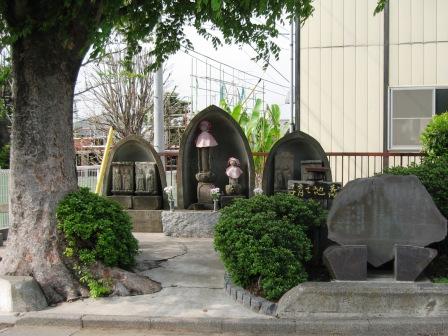 | 広くなった旧道をすすみ、「泣坂上」の信号で、先ほど横切った広い道路を横切る。200mほど進むと、左の角に3体の石仏がある。 左は、文化9年(?)(1812)、真中の坐像は、元文3年(1738)とある。 すぐ先で広い道路と合流し坂道を下る。。恩田川の支流を渡り、246号線(厚木街道)を渡って再び緩やかな坂を上がる |