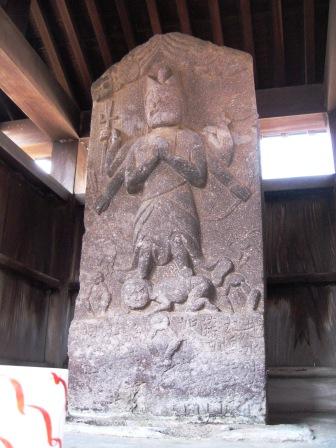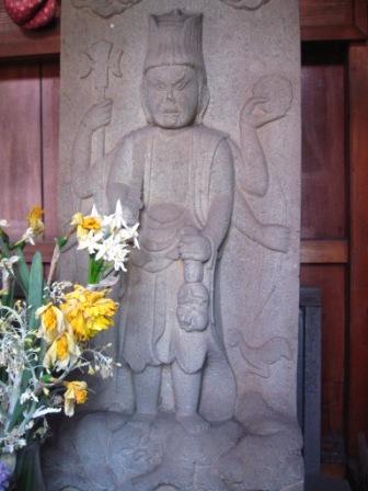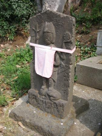 先に進む前に、早瀬川の対岸、246号線を越えたところにある観福寺に寄り道する。246号線の荏田の交差点に入る手前の交差点の所にあった道標が、造成中のため観福寺に保管されているというメモがあったので、確かめに行った。境内に「馬頭観世音」 側面に「登戸・・・・」と刻まれた石塔がある。文化12年(1815)に建てられた。 |