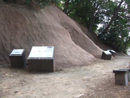 地蔵堂の北の小学校の西側を回って市ヶ尾遺跡公園の南にある横穴古墳群に行く。 公園の丘の斜面に、6世紀後半から7世紀後半にかけてつくられたもので、19基の横穴墓がある。説明板があり、「前庭部と呼ばれる横穴入口に近い墓道の部分からも、刀、土器類が発見され、祖先の霊を祭る儀式が行われていたと考えられる」という。 |