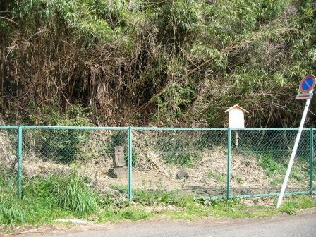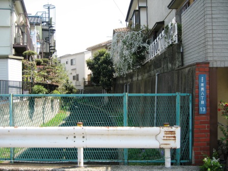 もとの道に戻り、北に進む。市営地下鉄のガードをくぐり、坂道を上がるとバス道路に出る。その道なりに越えて坂道を上がって行く。上りきると尾根沿いの道となり、右側は斜面で植木等が栽培されている。その先は住宅街となり、旧道は消える。見落としてしまうほどの有馬川をわたり、246号線をこえる。 |