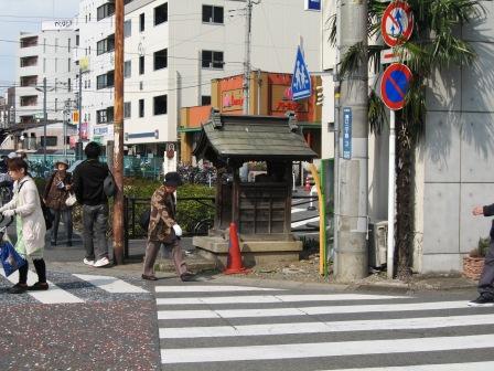 古道らしい風情のある道で、坂道をくだっていく。 その先商店街となり、溝の口の駅前である。信号を渡った先には、庚申堂が立っている。 |