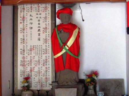すぐ東に、地蔵堂がある。堂に上がる石段の左側に地蔵など石仏が並んでいるが、そのうちの一つが庚申供養塔で、道標にもなっている。安永4年(1775)造立で、前面右側に 「上 江戸みち」、左側に 「下 大山みち」と刻まれている。 |