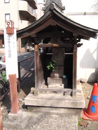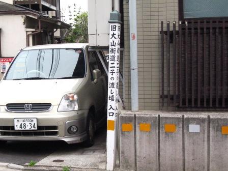 大山街道に戻るとすぐに、二子新地駅に向かう道と交差する。旧大山街道二子の渡し入口と書かれた標柱が駐車場脇に立っている。 | ||