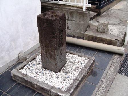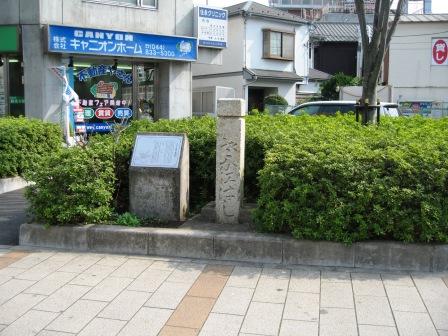 南武線の踏切を渡ってバス道路との交差点の手前に大山街道の大きな案内板と、さかえ橋の親柱石が建っている。 説明板によると、『さかえ橋は平瀬川と根方堀(二ヶ領用水)が交差したこの場所にあった。ここが溝口村上宿と下作延村片町の境にあったことから「境橋」、あるいは古代から中世にかけ、このあたりに馬上からの検見(けみ=見積り)で税などが免除された田畑があったと伝えられていることから「馬上免橋」とも呼ばれてきた。…中略・・・駅開発の工事にともない、さかえ橋の親柱石が掘り出された』という。 |