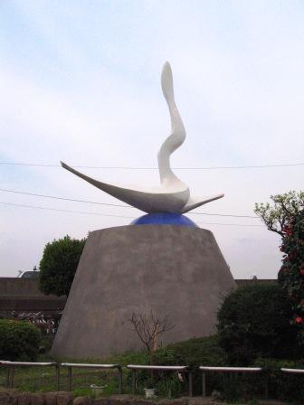 多摩川が近くなってきた左側に参道があり、その奥に二子神社がある。創立年代不詳、もと神明社といっていた。境内東側に塚があり、岡本太郎が、母親岡本かの子へのを想いを作品にした「誇り」と題する彫刻が立っている。 岡本かの子文学碑 |