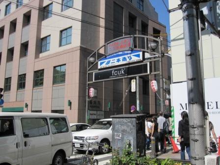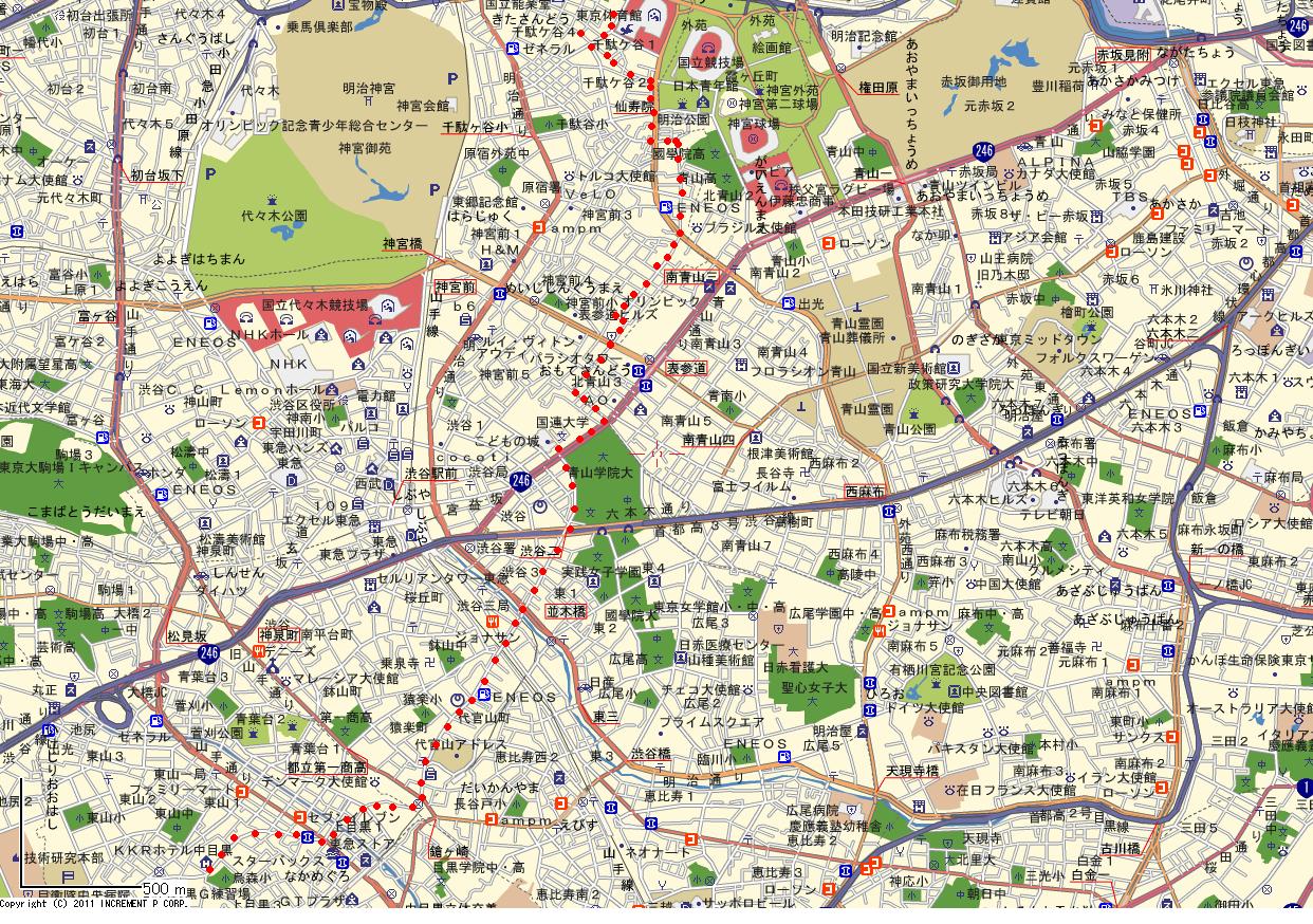 こどもの城の建物の前にある岡本太郎の「こどもの樹」を左にみて、青山通りを北に進む。 次の信号の手前の細い道を左に入り、3本先を北に行き、表参道に出る。 |