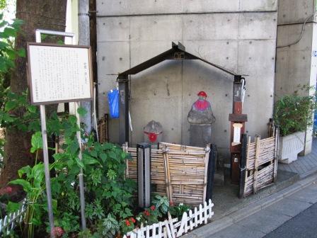 | 左側の広い歩道を進むと、デンマーク大使館の手前のビルとビルの間にこんもりとした木に覆われた塚があり、ビルの入口を進んでいくと説明板が立っている。 6〜7世紀の古墳時代末期の円墳であるが、源頼朝がここで猿楽を催した後、その用具を埋めたので猿楽塚と名付けられたという。2基の古墳があり、その間に目切り坂をくの字に曲がってきた細い鎌倉旧街道があったという。 塚の上にはこの地の旧家である朝倉家が建立した猿楽神社が建っている。 |
