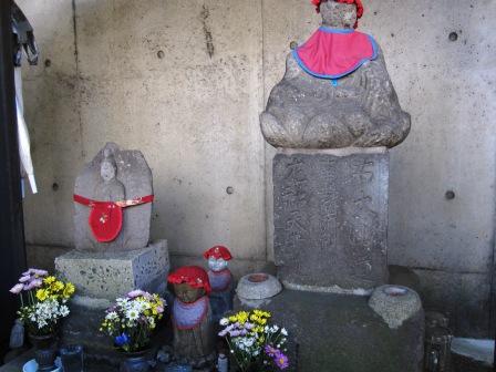 | 新宿門を出てすぐ右に進み2つ目の信号の地点から真北に向かう道がある。旧街道の続きで、その先左手の奥に太宗寺がある。 境内に「内藤新宿太宗寺の文化財」という大きな説明板がある。・・・・慶長元年(1596)頃、太宗という僧侶が建てた「太宗庵」が前身で、寛文8年(1629)内藤家から寺地の寄進を受け創建された、という。 また「内藤新宿の閻魔」「しょうづかのばあさん」として江戸庶民に親しまれた閻魔大王と奪衣婆像(毎年 7月15・6日に御開扉)など多くの文化財がある。 境内の右手には、江戸出入り口に安置された「江戸六地蔵」のひとつである銅造地蔵菩坐薩がある。(高さ267cm、正徳2年(1712)造立) |