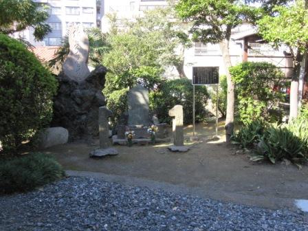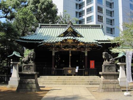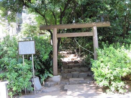 | 下った先で、旧道は消える。そこで、突当りを左折し、信号を右折して、北に向かい、観音橋交差点で西に向かって、 神亀年間(724〜729)または貞観年間(859〜877)の創建と伝えられ、千駄ヶ谷一帯の総鎮守として崇められていたという。 境内には「千駄ヶ谷の富士塚」といわれる都内では最古の富士塚がある。 寛政元年(1789)の築造といわれ、「円墳状の盛り土」と、塚築造のために土を採掘した後を利用して作った「前方にある池」という形は、江戸時代の富士信仰における基本様式であるという。 |