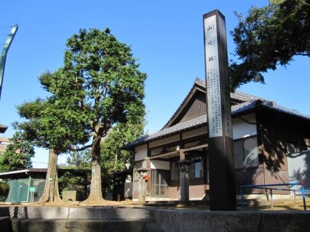 | 明治通りを越して坂を上って行くと、左にケヤキ並木があり、奥に金王八幡がある。説明板によると、渋谷氏の祖、河崎基家が寛治6年(1092)に創建したといわれる。社殿は慶長17年(1612)に造営開始され、江戸初期の様式をとどめており、また門は明和6年(1769)または享和元年(1801)の説があるが江戸中期のもので、その後修理はされているという。 この辺り一帯は平安時代末期から渋谷氏一族の居館(城)跡で、大永4年(1524)の北条氏と上杉氏との合戦の時、北条軍に焼き払われたという。 |