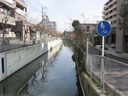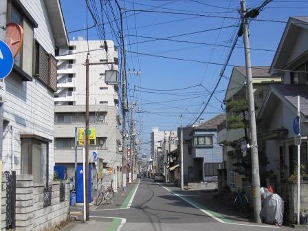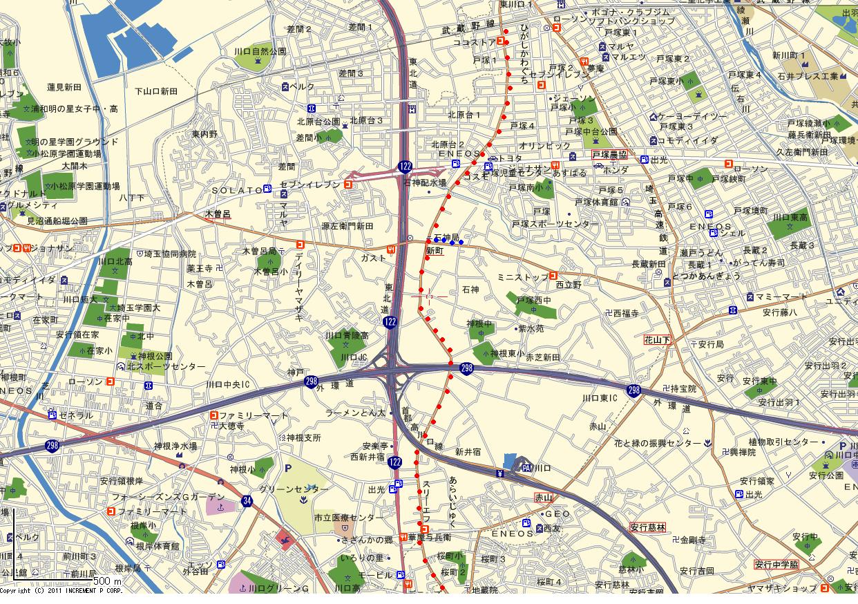 | 橋を渡りきった西側に川口南中学校があり、信号で堤防におりて廻り込んで中学校の南側に出る。 もとの橋の信号までもどり堤防を100mほど西にいくと、堤防脇の道路に信号があり、そこから道が北に続いている。御成街道の時代の川口宿があった通りである。 |