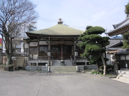 今はトラックなどが行き交う4車線の広い道路であるが、途中の交差点の左には小さな祠がたち、歴史を偲ばせる。 ひたすら歩き、埼玉高速鉄道の南鳩ヶ谷駅を過ぎた先の交差点から東へ200mほどの所にある実正寺に行く。 |