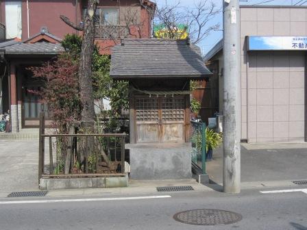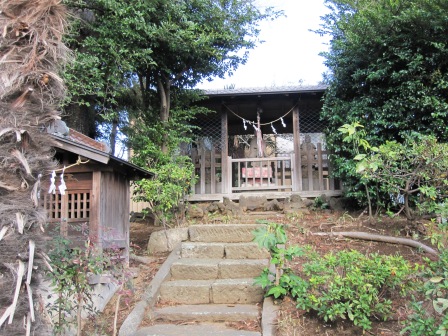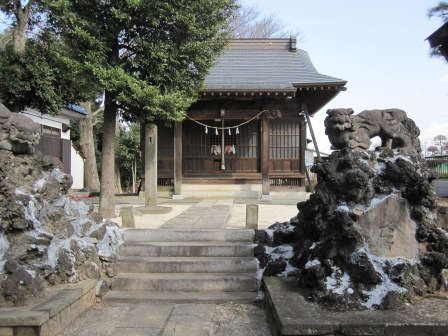 | まもなく武蔵野線を越すと、火の見櫓が立ち、その広場に真新しい鳥居に諏訪大明神とかかげられた神社がある。広い境内で、その奥から東川口駅前に広がる街並みが見渡せる。 |
