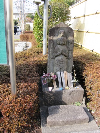 | 入口まで戻り、三叉路で北西の道を進む。 途中バス駐車場の端の目立たない場所に小さな祠が立ち、2体の地蔵尊が並んでいる。元禄6年(1694) と宝永3年(1706)とある。 その先で東方向に埼玉高速鉄道の新井宿駅のある交差点を渡る。 |