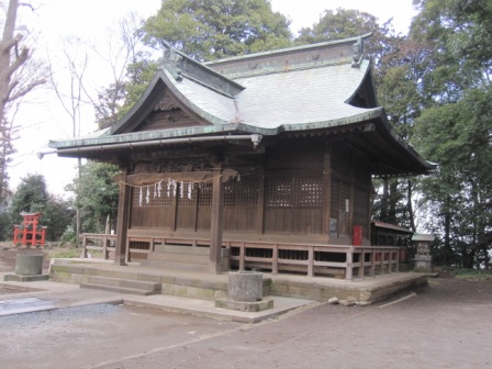| 左に入ると創立が応永元年(1394)という、氷川神社がある。 徳川家康が慶長6年(1600) 奥州出陣の途中境内で休息したという故事がある。 古い造りの家がある台地上の道を進む。 氷川神社の前の信号から3つ目の信号を左折し、台地を下りる。 100mほど先の森の中に長い参道のある法性寺がある。 |