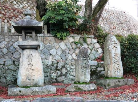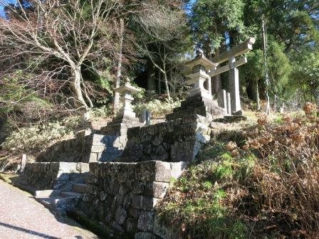 急な坂を上り切る手前に神社がある。 木曽御嶽講の開祖として知られる 、覚明上人が、ここの茶屋に泊まったのを記念して建てられたものという。すぐ先で「まき坂」という下り坂が始まる。右側の石垣の上に、元禄8年(1695)の供養塔と馬頭観音が建つ。 |